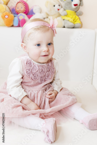 inside, indoor, person, people, children, children, toddler, girl, little girl, childhood, youth, 1, blond, blond, portrait, smiling, positive, sitting, innocence, careless, toy, stuffed toy, plush toy, infantile, fashion, shoe, dress, headdress, headband, pink