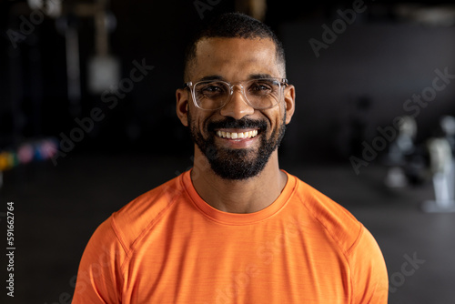 Portrait of smiling bearded biracial young man wearing eyeglasses standing in gym
