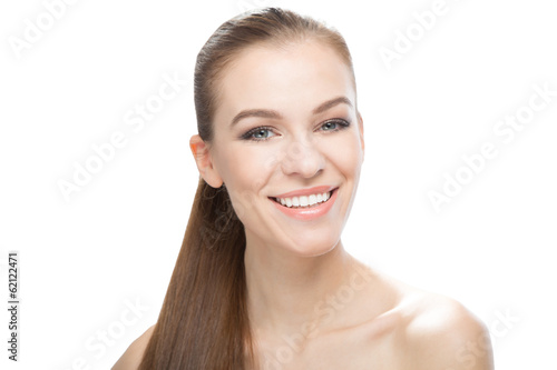 Portrait of smiling beautiful young woman, on white background