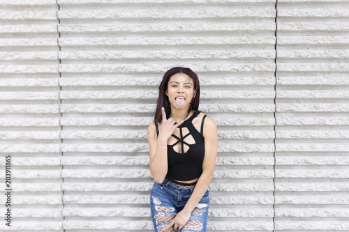 .Portrait of smiling girl posing with casual clothes on a wall