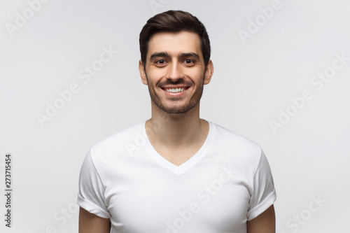 Portrait of smiling man in white t-shirt looking at camera, isolated on gray background