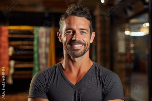 Portrait of smiling man with arms crossed standing in a fitness studio