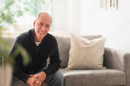 man, living room, sitting, sofa, portrait, horizontal, indoor, mature adult, one person, relaxation, front view, selective focus, pillow, painting, window, real people, resting, sweater, t-shirt, blue eye, smiling, fun, enjoyment, content, carefree, confidence