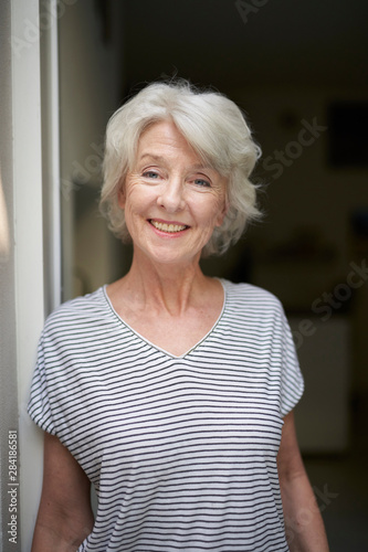 portrait, smiling, mature, woman, standing, front, open, terrace, door, t-shirt, happiness, leisure, attractive, outdoors, front view, day, positive, natural, waist up, optimistic, casual attire, beauty, confidence, stripes, smile, asking, opened, beautiful, alone, 1, people, caucasian, grey hair, short hair, wrinkle, white hair, emotional, emotion, pattern, adult, hair, skin