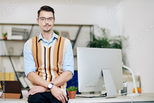 Portrait of smiling young computer engineer in glasses standig at office desk and looking at camera