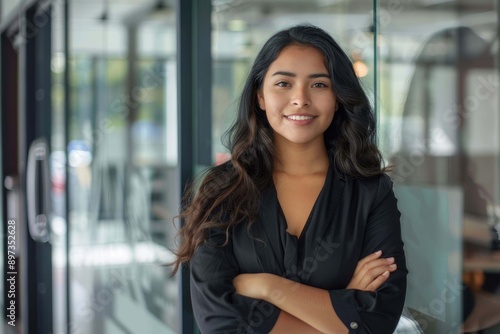 Portrait of smiling young multiethnic woman looking at camera with crossed arms. Successful latin business woman standing in modern office with copy space. Young university hispanic girl with smile.