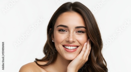 woman, portrait, face, beauty, young, girl, beautiful, model, female, hair, skin, brunette, pretty, person, head, cute, adult, closeup, attractive, look, style, people, eye, 1, smiling, background, white, long, natural, make-up, portraiture, indoor, coiffure, studio, hand, isolated, expression, fashion, elegance, lady, caucasian, sensual, mouth, teeth, shoulder, lip, neck, cheek, touching