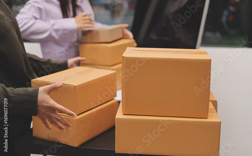 Portrait of Starting small businesses SME owners, two Asian woman check online orders Selling products working with boxs freelance work at home office, sme business online small medium enterprise