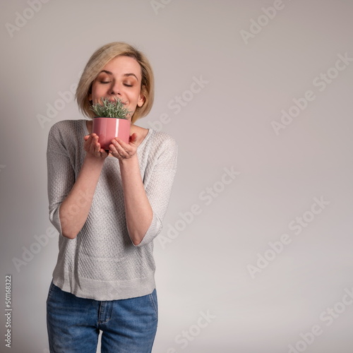 Portrait of stylish, nice, cute, modern woman, smelling potted plant holding in hands, closed eyes, casual outfit