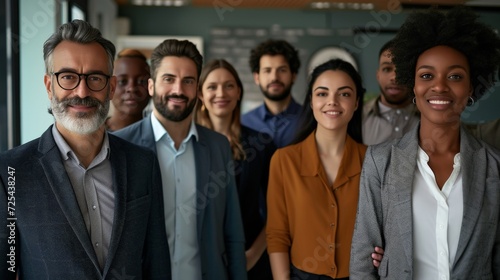 Portrait of successful group of business people at modern office looking at camera. Portrait of happy businessmen and satisfied businesswomen standing as a team. Multiethnic group of people smiling.