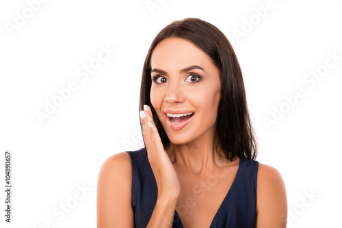 adult, amaze, amazement, attraction, attractive, background, beautiful, beauty, brunette, business, businesswoman, casual attire, caucasian, cute, dress, elegance, emotion, expressing, face, female, gesture, girl, girlfriend, good, hand, happy, head, isolated, joy, lipstick, look, make-up, model, mood, mouth, opened, palm, people, person, portrait, positive, sexy, shock, student, surprise, touch, white, woman, work, young