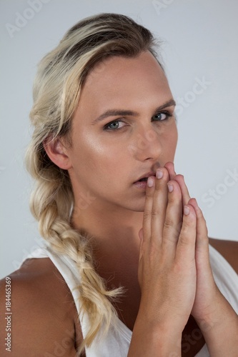 hand, woman, clasped, leisure, long, constructed, background, grey, transgender, casual attire, sex, blond, self, against, camera, androgynous, lifestyle, confidence, caucasian, ethnicity, beautiful, confident, attitude, gorgeous, activity, clothing, portrait, cosmetic, standing, looking, glamour, sleeve, serious, staring, fashion, beauty, year, blend, adult, pride, young, black, white, male, with, hair, eye, man