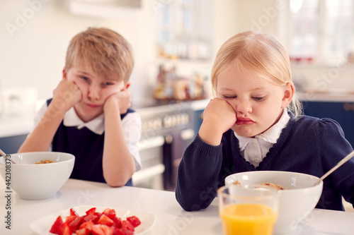 Portrait Of Two Fed Up Children Wearing School Uniform In Kitchen Eating Breakfast