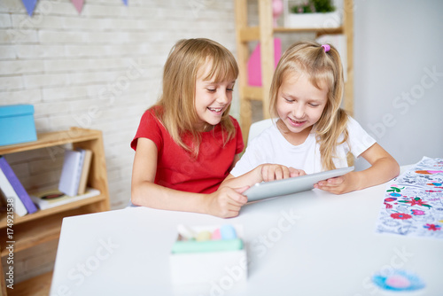 Portrait of two happy little sisters using digital tablet together and smiling sitting at desk in playroom