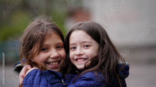 Portrait of two pretty little girlfriends hair in a park
