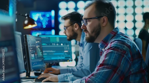 Portrait of two professional male programmers working on computer in diverse offices Modern IT technologies development of artificial intelligence programs applications and video games : Generative AI