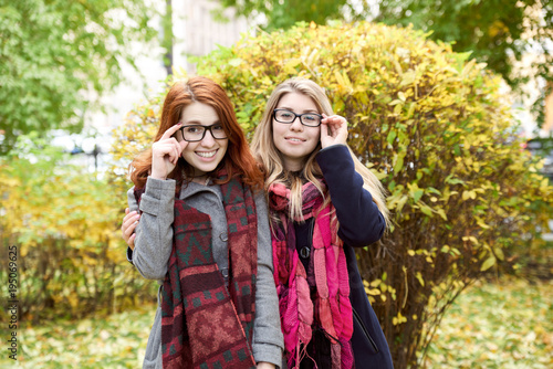 portrait of two smiling long-haired cute girlfriend College girls in glasses dressed in a coat and scarf