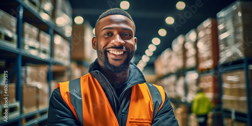 Portrait of warehouse worker wearing a hi-vis jacket stood in a distribution center. Generative ai