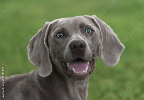 Portrait of Weimaraner breed hunting dog against green blurry background. Close.