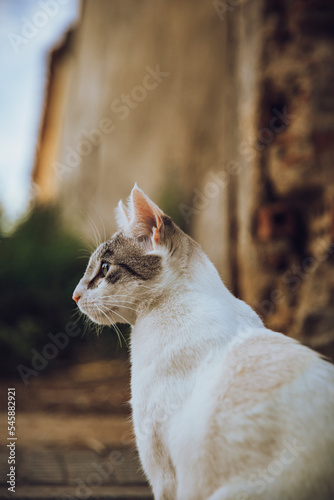 white, cat, sitting, outdoors, animal, day, domestic cat, pet, one animal, spain, looking, nobody, alertness, colours