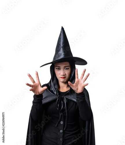 Portrait of woman in black Scary witch halloween costume standing with hat isolated on white background