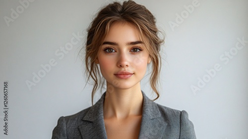 woman, portrait, young, female, attractive, beautiful, model, natural, beauty, face, hair, brown, curly, updo, grey, blazer, neutral, colours, studio, shot, light, background, soft, lighting, fashion, photo, business, professional, confident, make-up, casual attire, wear, tone, stylish, elegant, modern, simple, posh, professionalism, glamourous, pretty, cute, charming, feminine, portraiture