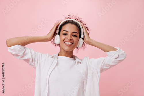Portrait of woman in white outfit and massive headphones on pink background. Smiling girl listening to music on isolated backdrop