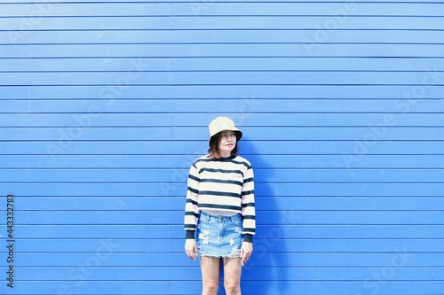woman, young, fashion, people, beautiful, portrait, person, smiling, beauty, happy, cute, model, isolated, standing, 1, jean, smile, looking, look out, summer, wall, blue
