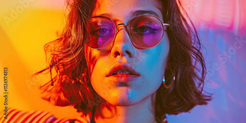 Portrait of Woman with Round Glasses and Wavy Hair under Colored Lighting