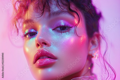 Portrait of woman with shimmering purple makeup creating ethereal glow and captivating look, with detailed and delicate facial features enhancing the overall visual aesthetic