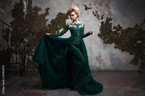 Portrait of young attractive blonde woman in a beautiful green dress. Textured background, interior. Luxury hairstyle
