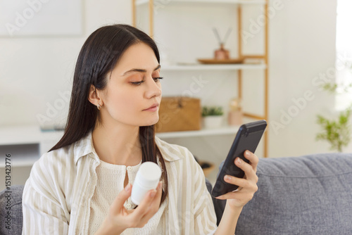Portrait of young confident woman sitting in living room at home with a plastic bottle of medical pills browsing internet on mobile phone reading drug use instruction or buying medication online.