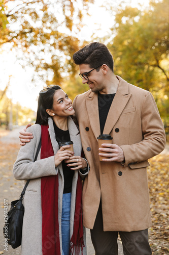 Portrait of young couple drinking takeaway coffee and looking at each other while walking in autumn park
