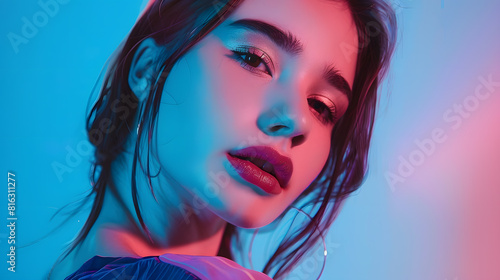 Portrait of young female singer isolated on bluepink background : Generative AI