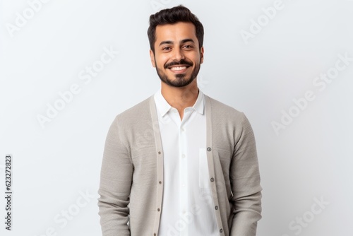 Portrait of young handsome indian man smiling and looking at camera