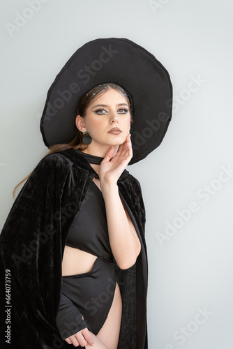 Portrait of young sexy woman in black witch hat, bodysuit and cloak. Dark makeup. White background. Halloween party, sexy witch