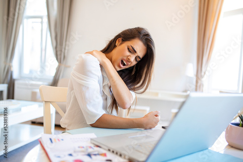 Portrait of young stressed woman sitting at home office desk in front of laptop, touching aching back with pained expression, suffering from backache after working on laptop
