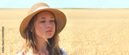 Portrait of young teenage girl with closed eyes standing in a wheat field over blue sky background. Young girl outdoors.
