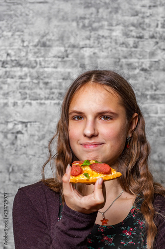 portrait of young teenager brunette girl with long hair eating slice of pizza on gray wall background