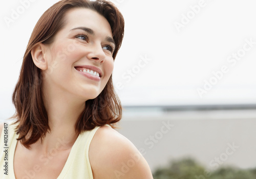 portrait, smiling, beauty, closeup, cheerful, happiness, daydreaming, one person, charming, toothy smile, temptation, horizontal, outdoors, day, looking away, young adult, lifestyle, brown hair, tank top, femininity, serene people, smile, cheerfulness, happy, dreaming, daytime, youngster, woman, female, serenity