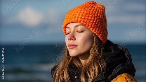 Portrait of young woman by the sea in knitted hat and winter jacket, eyes closed practicing mindful breathing, calm expression, serene moment of inner peace, relaxation and mindfulness