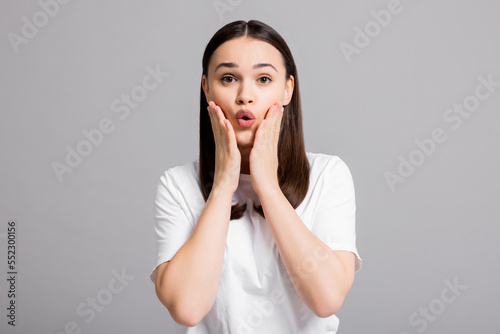 Portrait of young woman girl wearing white t shirt standing on grey background showing surprised emotions holding hands near face opening mouth.