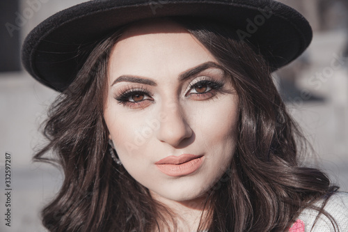 1, looking, style, eye, elegant, black, hair, beauty, fashion, face, portrait, girl, female, beautiful, young, woman, attractive, model, make-up, caucasian, adult, closeup, glamour, pretty, lady, outside, lifestyle, lovely, spring