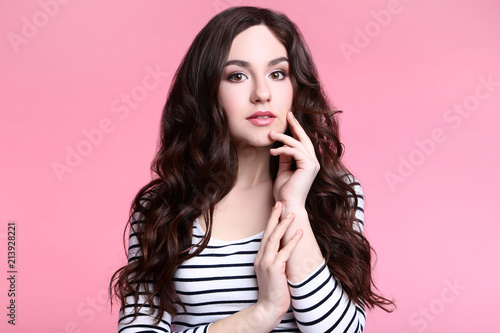 hand, adult, fashion, skin, beauty, expression, lady, elegant, elegance, girl, joy, white, happiness, blouse, gorgeous, female, young, beautiful, hair, cheerful, background, looking, brunette, colours, people, smile, happy, cute, natural, wear, style, caucasian, modern, lovely, clothes, pink, face, striped, attractive, model, pretty, woman, lifestyle, teenage, portrait, emotion