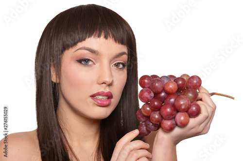 adult, attractive, background, beautiful, beauty, caucasian, cheerful, emotion, eye, face, female, food, fresh, freshness, fruit, girl, grape, isolated, joy, lady, lifestyle, person, portrait, pose, posing, positive, pretty, studio, white, woman, young