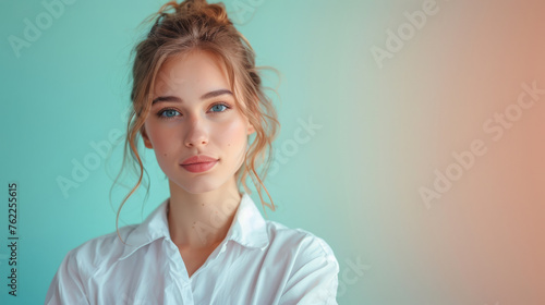 Portrait of young woman with clear blue eyes and neatly styled hair, wearing a white shirt, against a soft teal background.