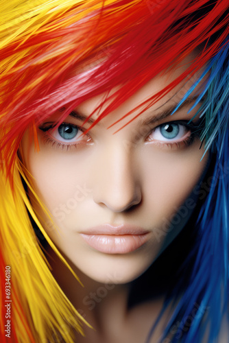 Portrait of young woman with colorful hair like feathers , tropical bird girl style