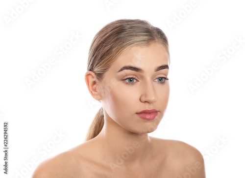 Portrait of young woman with natural eyelashes on white background