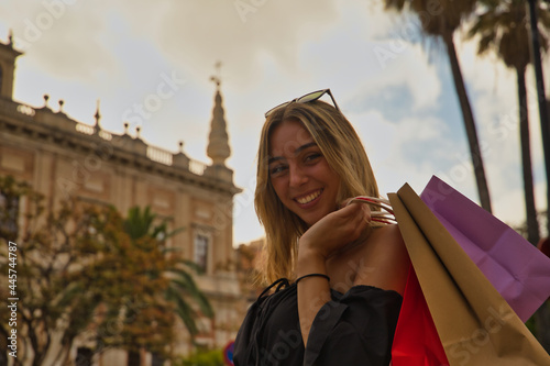 Portrait of young woman with sunglasses on her head and shopping bags over her shoulder smiling and looking at camera.