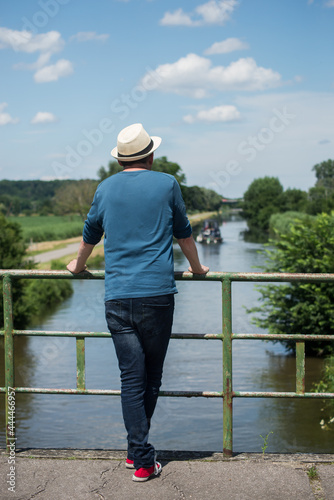 Portrait on back view of man standing on bridge on wthe water looking the rural landscape